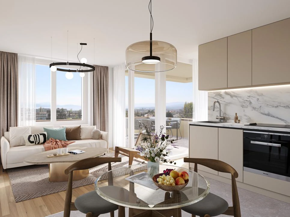 Depuis ses extérieurs comme depuis le séjour, l'appartement bénéficie d'une magnifique vue panoramique sur le Lac Léman et les Alpes, offrant un cadre de vie unique entre lumière, nature et sérénité.